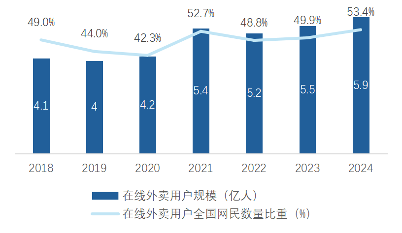 陪伴互联网及挪动互联网不竭普及,正在线外卖行业已成为餐饮行业的主要构成部门。据CNNIC数据,2024年我国正在线亿人,占全国网平易近数量比沉为53。4%;同时外卖体验持续升级,外卖超时率降至4。8%,推户日益活跃。