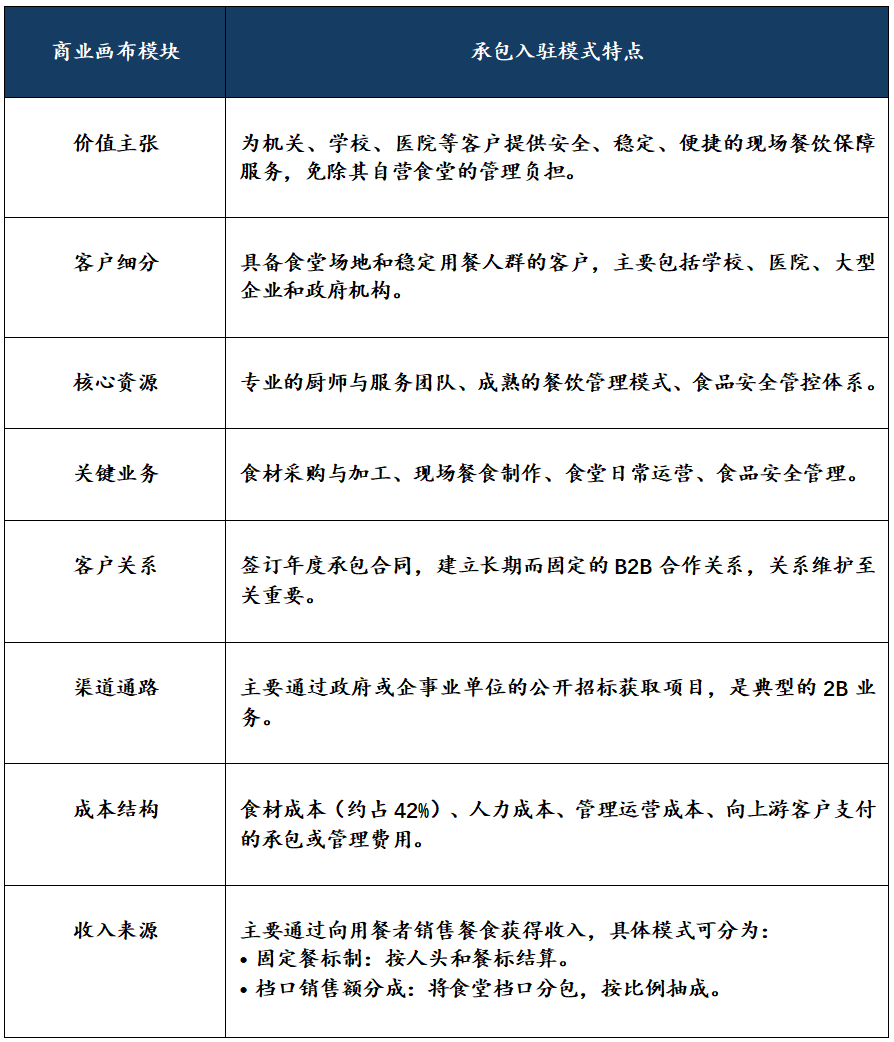 承包入驻模式为中国团餐行业的次要运营模式。以学校场景为例,团餐企业取学校构成年度合做,入驻学校食堂,正在食堂内完成食材处置、餐食制做、学生就餐等勾当,因而,承包入驻模式适配于具备必然规模且有固定食堂场合的学校、病院、大型企业、机构等客户场景,获客难度较大,难以实现营业规模化扩张。