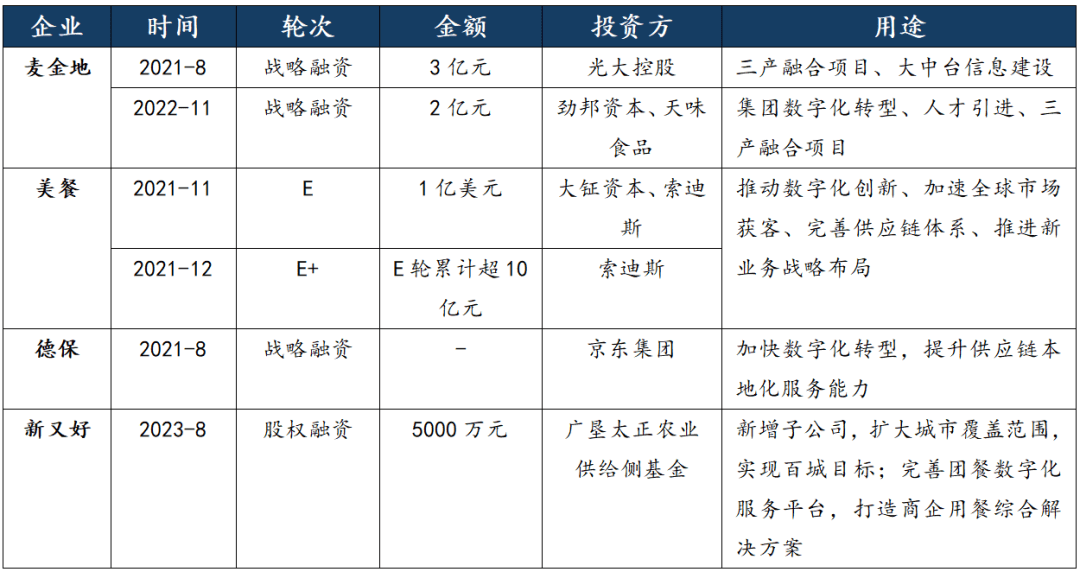 近年来,团餐行业持续获得资金注入,且金额较大,融资次要用处为:(i)取处所合做开展三产融合项目,有帮于团餐企业普遍笼盖县域客群并保障食物质量;(ii)数字化供应链扶植,有帮于团餐企业提拔办事能力取内部资本操纵效率;(iii)通过企业整合实现跨区域扩张。这表白团餐行业进入尺度化、消息化、规模化成长阶段。