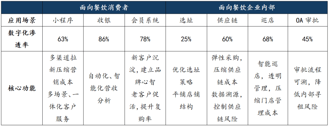 陪伴互联网取餐饮行业连系愈加慎密,头部社会餐饮企业通过使用数字化办事提拔消费者下单便利性取本身运营能力。因为企业内部数字化使用时间周期取成本均较高,消费者端数字化办事渗入率遍及高于餐饮企业内部数字化办事渗入率。团餐企业的数据孤岛现象较为严沉,存正在采购流程欠亨明、运营成本高企等问题。社会餐饮范畴的“点单办事、收银及营收阐发、客群运营”等面向餐饮消费者的数字化手艺无望正在团餐范畴加以使用,打破团餐财产链数据畅通壁垒,提高团餐企业数字化运营能力。