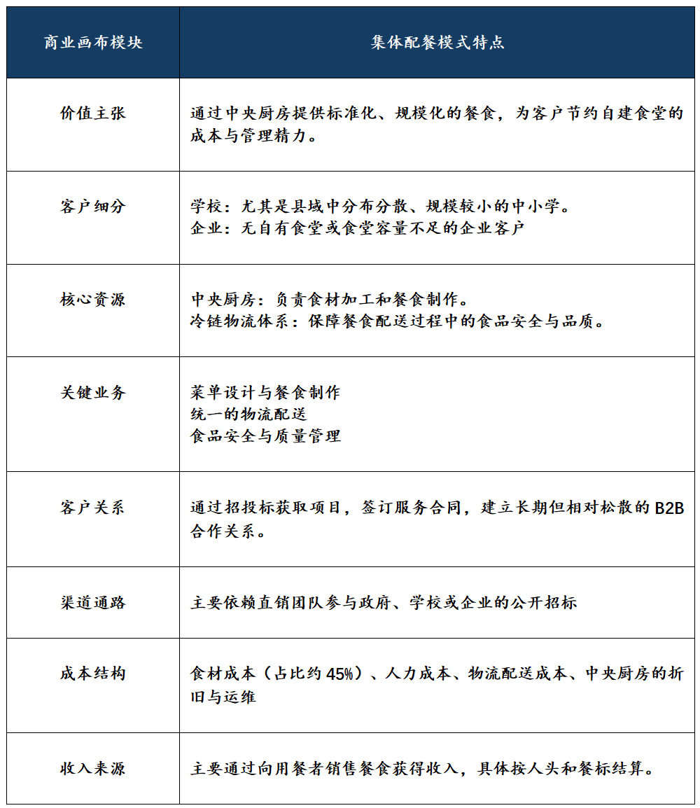 集体配餐模式无需现场制做,其焦点正在于,通过地方厨房实现尺度化、规模化出产,并操纵物流收集将餐食配送至客户指定地址。该模式次要办事于不具备固定食堂场合或规模较小的学校、企业等客户。