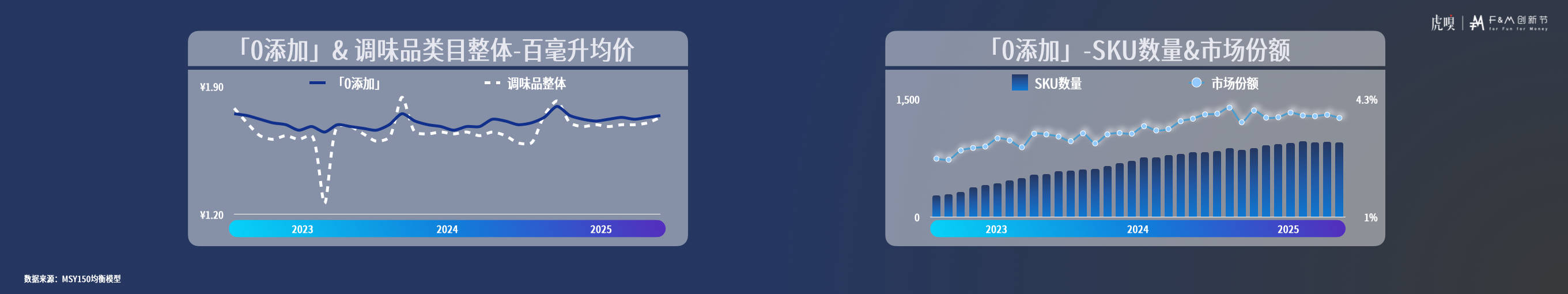 从数据能够看到,零添加产物的均价正在过去确实比类目全体的均价稍微高一点点,但现正在也起头趋同,大概能够申明概念所可以或许带来的溢价正正在衰退。每个类目都需要新概念来驱动增加,所以2025年3月之前,零添加调味品的SKU数量和市场份额都正在快速增加,但其实正在3月当前,能够看到,份额曾经有着比力较着的掉头向下的趋向,SKU数量也不再快速增加,以至将正在将来跟着律例的临近逐步下滑。